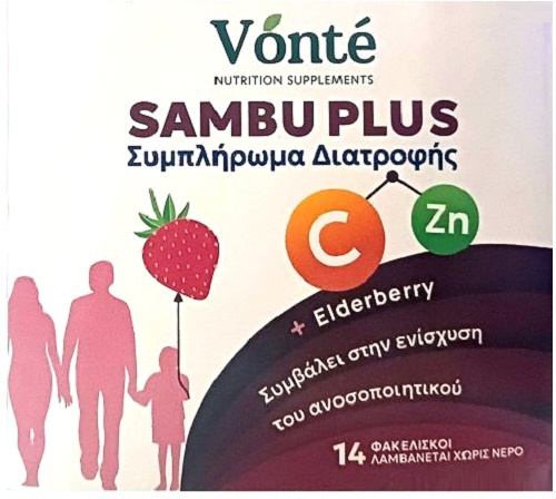Το συμπλήρωμα διατροφής Sambu Plus της Vonte Nutrition συμβάλλει στην ομαλή λειτουργία αλλά και την ενίσχυση του ανοσοποιητικού συστήματος Η σύνθεσή του, γλουτένη, λακτόζη ή ζάχαρη, αποτελείται από βιταμίνη C, κιτρικό ψευδάργυρο και εκχύλισμα σαμπούκου καθώς και ξυλιτόλη, διοξείδιο του πυριτίου, γλυκαντικά από το φυτό στεβια και γεύση φράουλας.